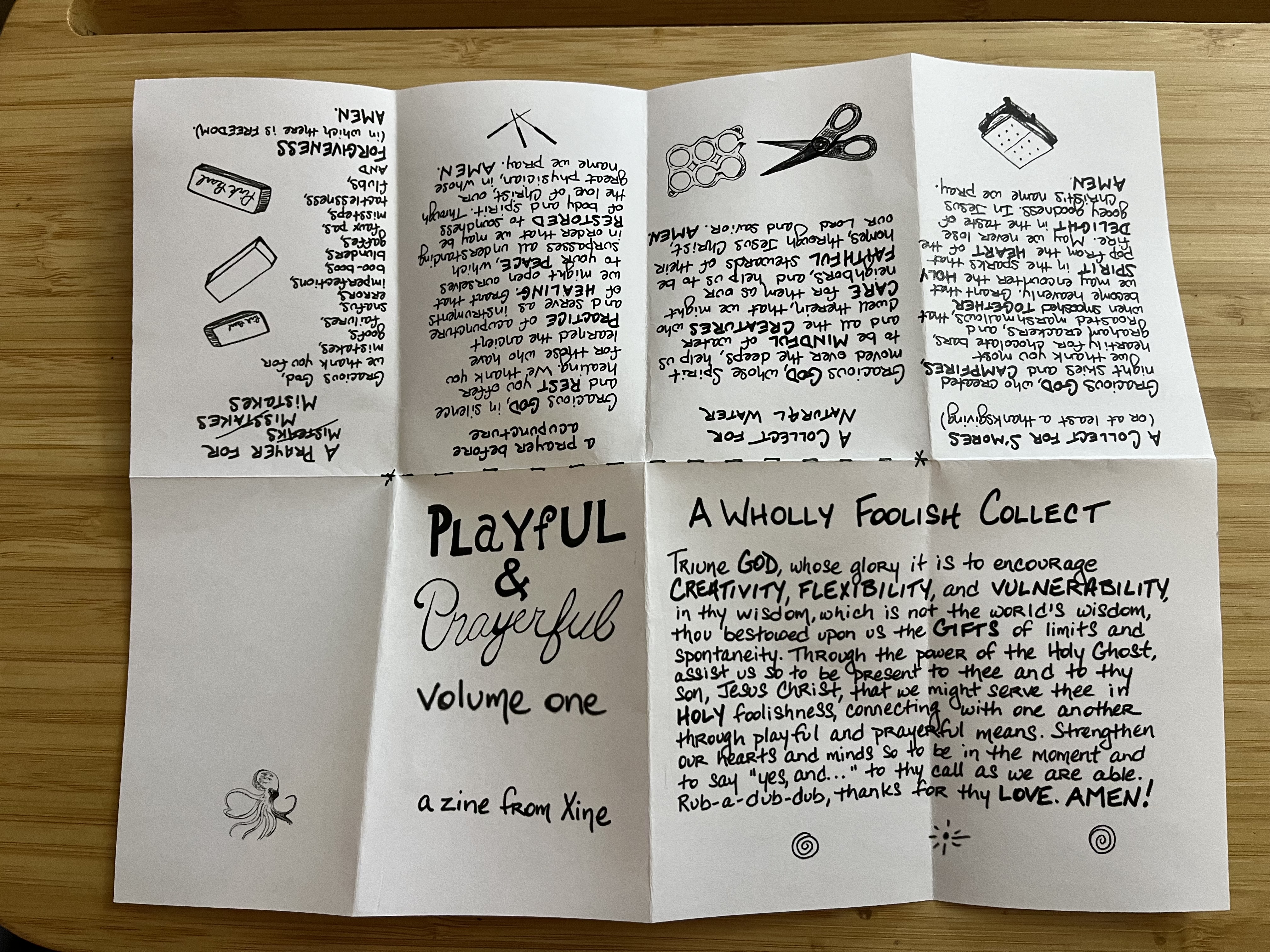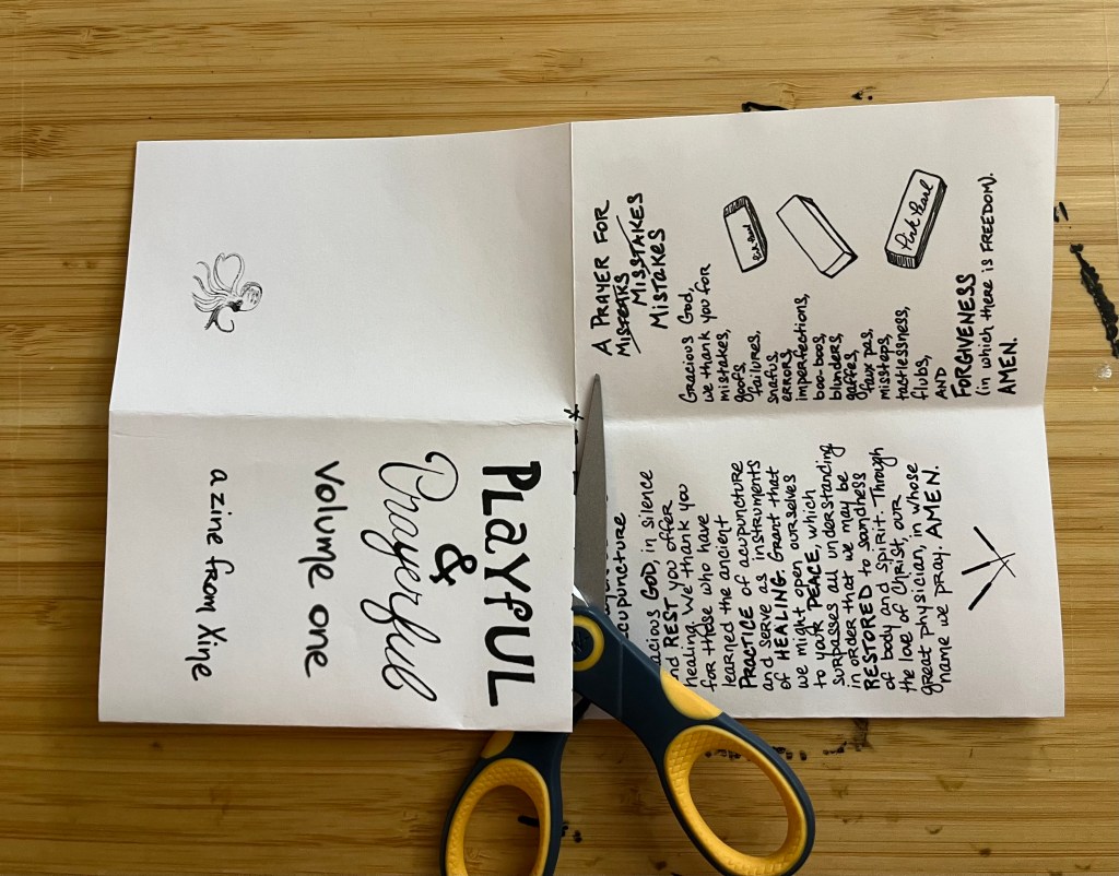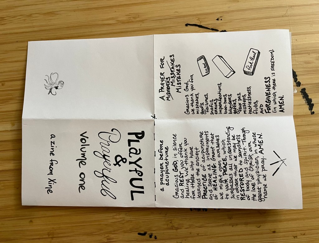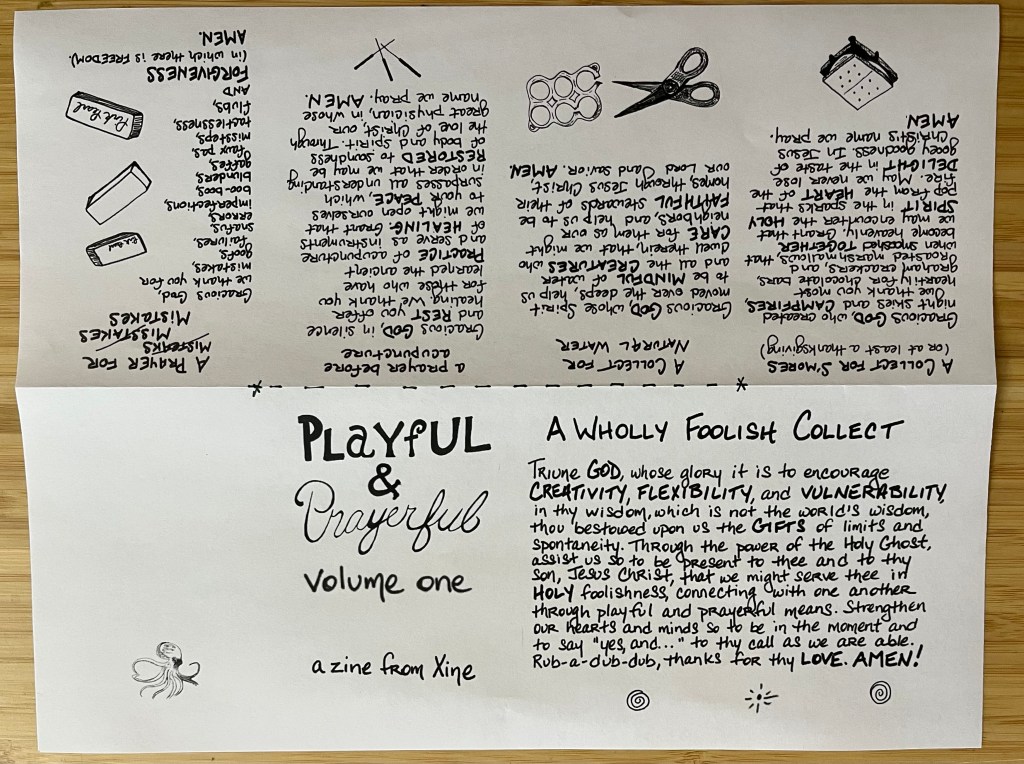Playful & Prayerful Volume One is my first zine–a collection of prayers and collects written over the past ten years or so, most with the help of friends, and all with the help of the Holy Spirit. In particular, I want to thank the Rev. Travis Helms, the Rev. Jeff Bohanski, the soon-to-be Rev Scott Madison, the Rev. Hunter Ruffin, the Rev. Christian Hawley, Bonnie Walton, and Will Boesl for their editorial guidance and encouragement.