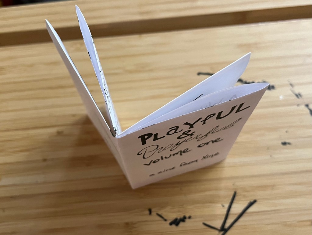 What is a zine (“zeen”)? They’re little booklets, often made on one sheet and folded. Author/illustrator Austin Kleon inspired me with his own. Some are stapled booklets (The Raven Bookstore in Lawrence, KS, has some great examples).